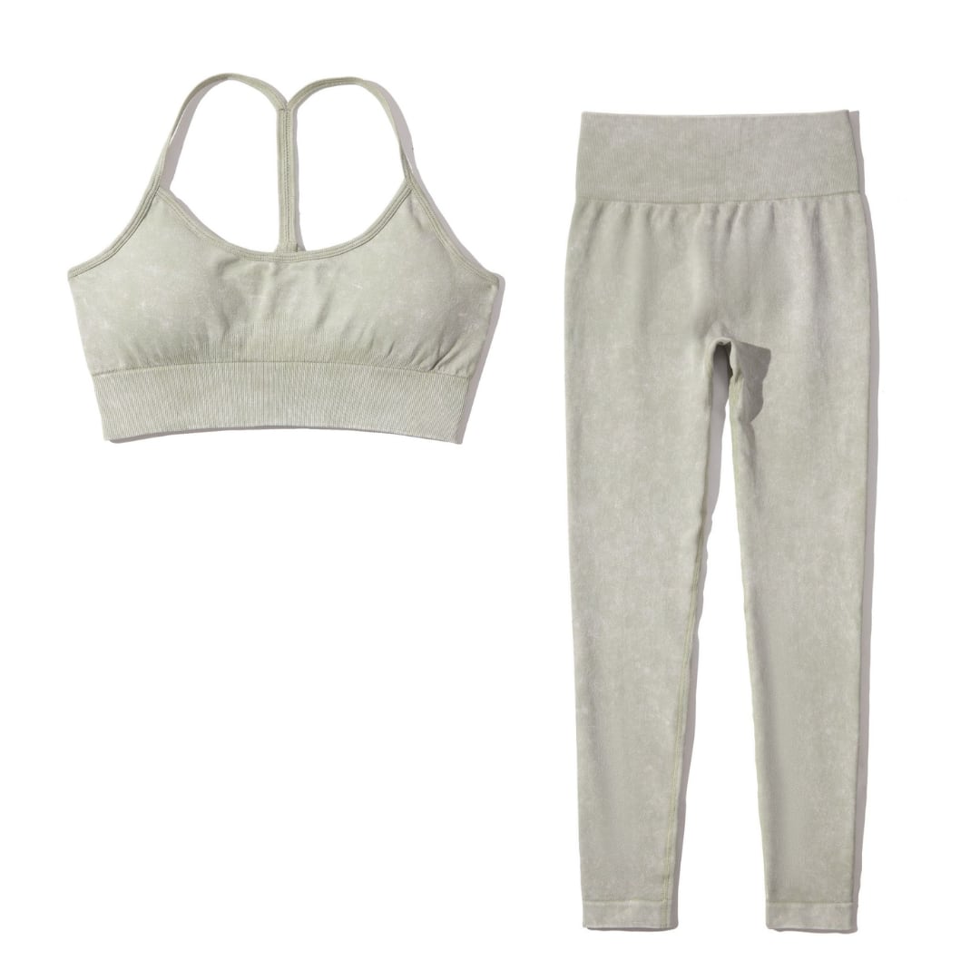 サンドウォッシュ加工デニム風 シームレス ヨガウェア 美背ブラ付き フィットネス&ヨガセット