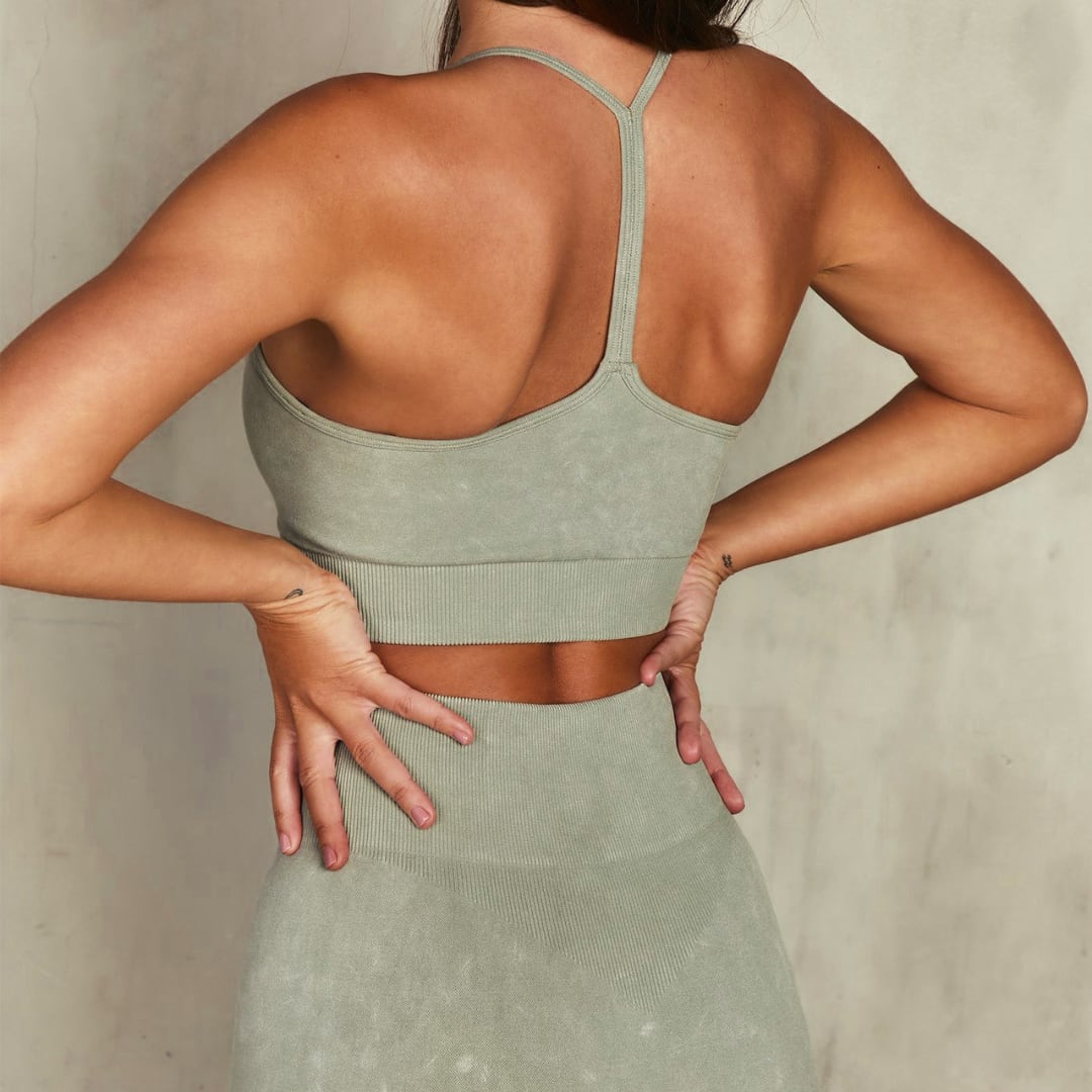 サンドウォッシュ加工デニム風 シームレス ヨガウェア 美背ブラ付き フィットネス&ヨガセット カーキ